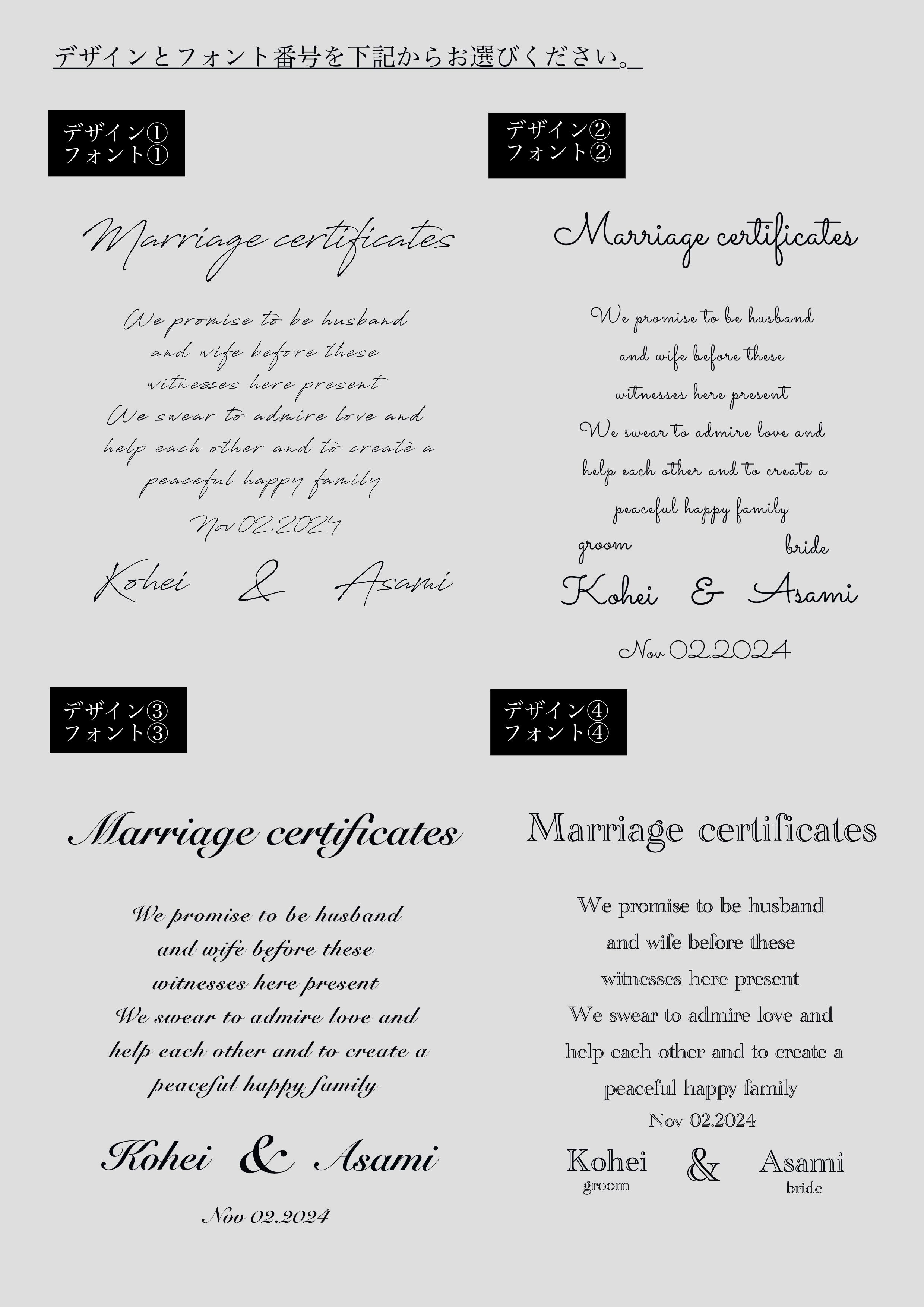 「新郎 Naoto 新婦 Ano」(ご自身でお名前を記入されたい方は“名前彫刻なし“と記入ください)